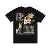 Off white t-shirt featuring photo of Taylor Swift and “Can you feel this magic in the air? It must have been the way you kissed me. Fell in love when I saw you standing there. It must have been the way. Today was a Fairytale” song lyrics and “Taylor Swift” with border and star design printed on front.